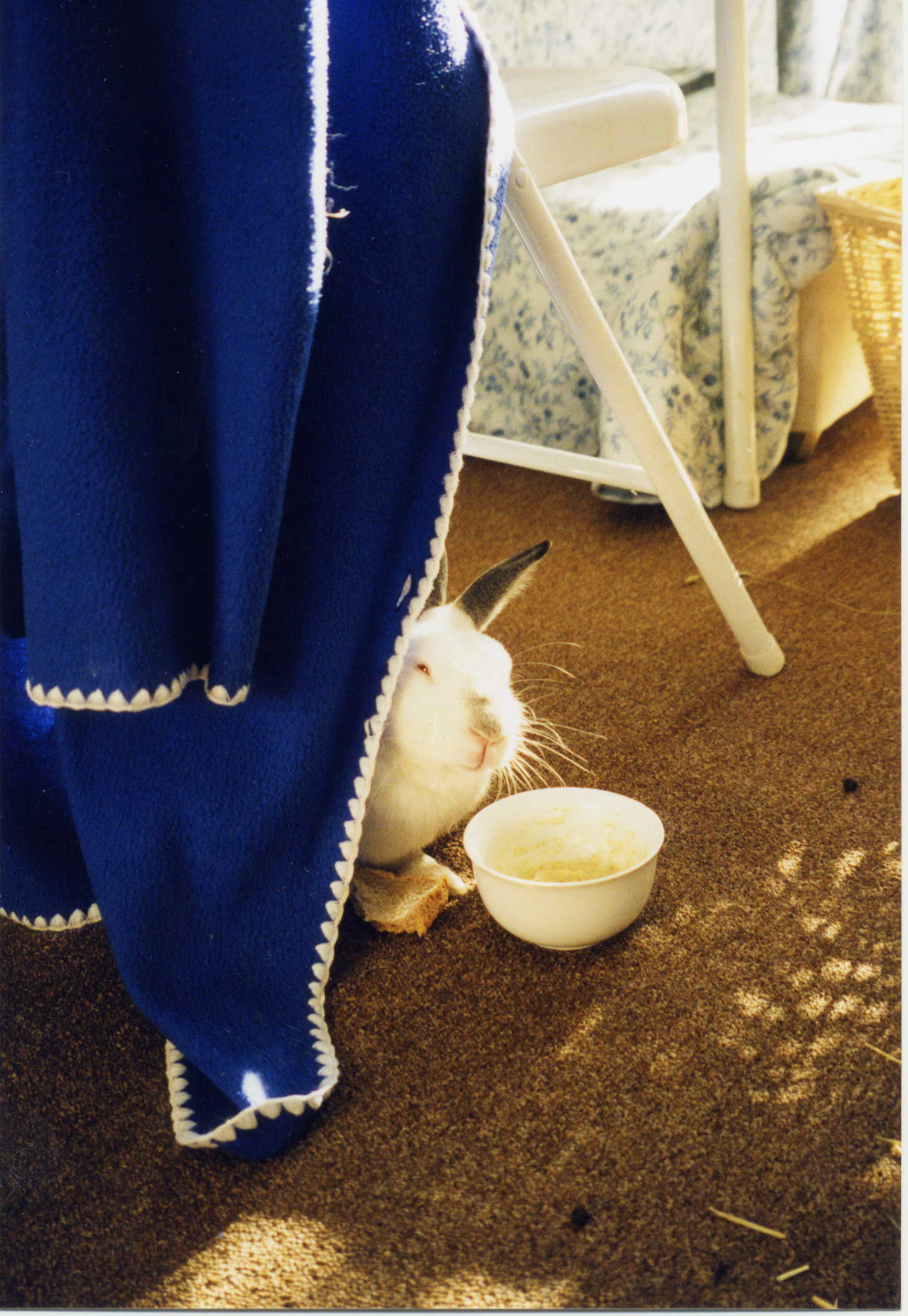 Six year-old bunny Benjamin arrived at our foster home in February 1998. Benjamin spent the first year of his life as a children’s pet, and when they lost interest, he was often left without food or water. Eventually a neighbour offered to take him, even though she could not care for him properly. Benjamin spent the next five years living on a garage rooftop without any grass or company. Because his carer was not well, she had to depend on other people to buy rabbit supplies or take Benjamin to the vet. As a result Benjamin sometimes lived on stale food and went without veterinary care. When he was 6 years old the lady decided she didn’t want him anymore and sent him by cab to our foster home. Benjamin had been described as a pure white dwarf lop, so we were surprised to see a handsome grey and white up-eared bunny. Being gentle and sweet, several people wanted to adopt him, but changed their mind when they learnt about his age. By chance we discovered our rabbit Carolina was in love with Benjamin, and leaped for joy whenever she was near him. Benjamin too was smitten with her and would follow her around like a puppy. Faced with this budding love story, we just had to adopt Benjamin as a friend for Carolina and he moved into our home as a free-running house rabbit. Benjamin quickly learnt to use a litter tray and being a senior bunny he is quiet and easy-going. He is completely devoted to Carolina and they are usually found snuggled up together under a chair or behind the sofa. On warm days he likes to go out in the garden to dig up the flowerbeds and sit in the sunshine. Benjamin has a sweet tooth and always begs for his Digestive in the mornings. When we return from the supermarket, he inspects all the bags hoping to find some bread or biscuits. Benjamin spends his evenings being cuddled in front of the television and a few months ago he started sleeping on our bed. He is wonderful to have around – a friendly, good-natured bunny with a warm personality. We are very fortunate to share our home with him and be able to provide the love and stability he deserves.