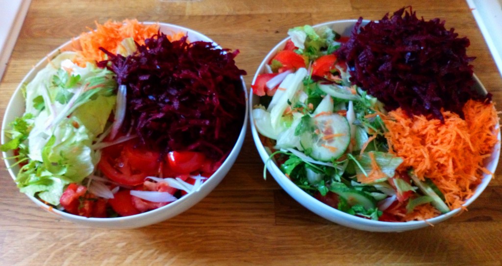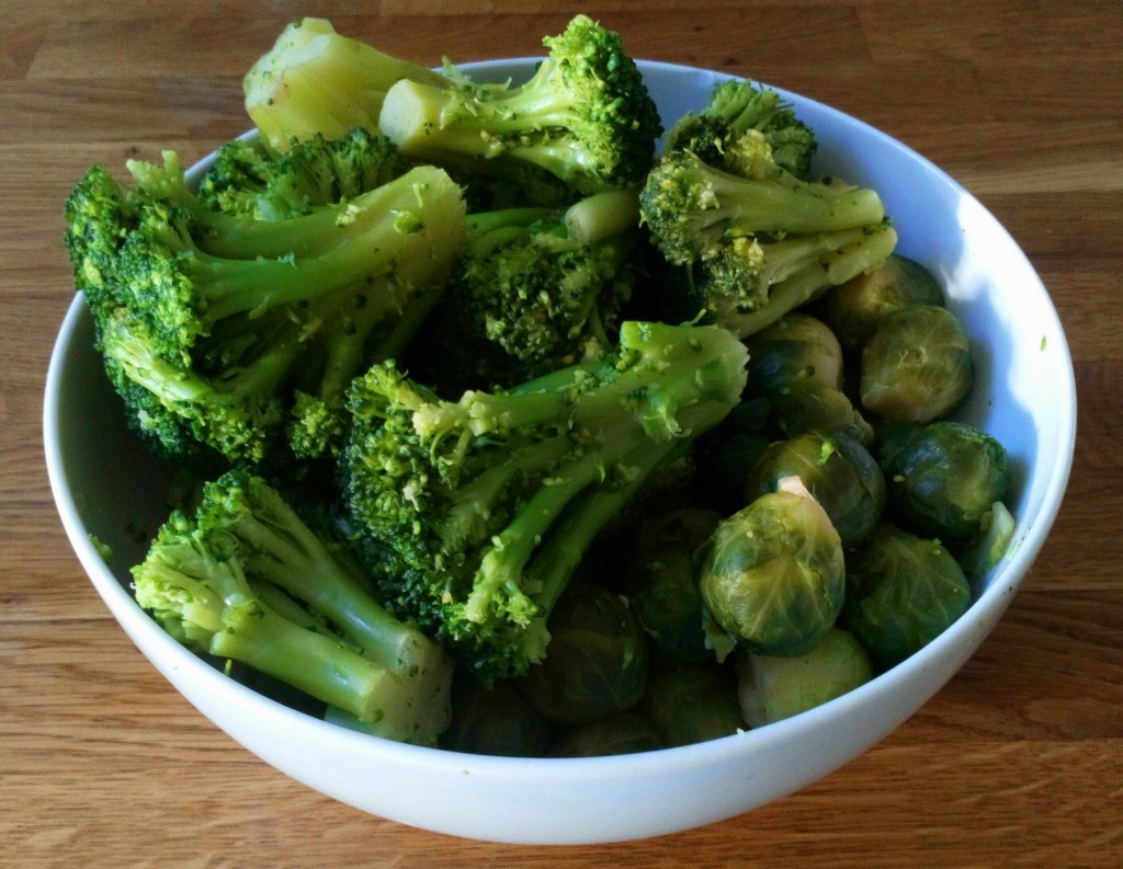 For a super-easy, filling salad in the colder months, simply microwave/roast 2 or more of your favourite fresh/frozen veggies, for example broccoli, carrots, Brussels sprouts, spinach or green beans. Use a fat-free dressing if desired – we add salt and balsamic vinegar to the spinach and green beans, nothing to the other vegetables.