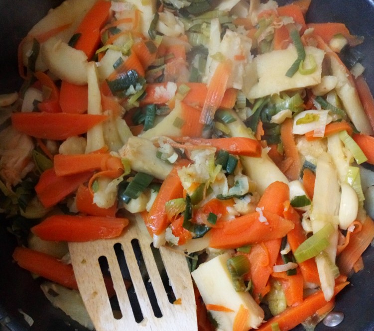 Place all the ingredients in a non-stick pan and cook on a medium heat until tender. From time to time, add a little water and stir.