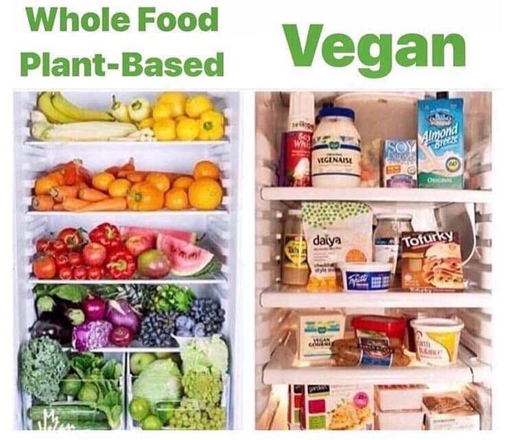 - Slim, healthy vegans v junk food, overweight vegans Just because something is vegan it does not mean it is healthy or slimming. Vegan processed foods (fake meat/cheese, ready meals, take-aways/restaurant meals) are OK occasionally and may help transitioning to a whole-food plant-based diet. But they usually have a lot of fats, sugar and salt, lead to overeating/weight gain and displace healthier choices. We love our simple whole-plant meals so much, that eating out or buying convenience food just doesn’t appeal anymore. You can prepare a delicious meal in minutes with a little practice, e.g. microwave sweet potato, veggies & tinned beans – kinder to your waistline and your pocket. And fruit is sweeter and more scrumptious than any fatty and sugary vegan dessert.